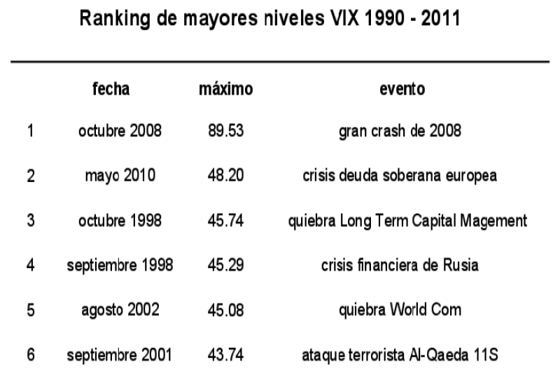 En mi libro, en el capítulo sobre el VIX, hay un apartado que trata de los grandes techos históricos del VIX, es decir de las mayores lecturas del llamado indicador del miedo. ¿Por qué dedique un apartado a los grandes techos históricos del VIX? Pues por la sencilla razón de que el mayor miedo genera siempre las mayores oportunidades. Es solo cuestión, no de imaginar o traer aquí teoría peregrinas, sino de observar el pasado con sentido común. Observemos la tabla de las mayores lecturas históricas del VIX: