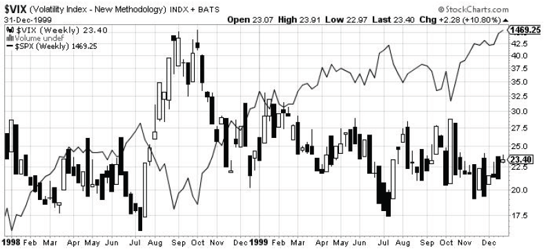 En 1998 Rusia se declaró en default. Con el default quebró el hedge fund LTCM el cual estaba bestialmente apalancado y sus apuestas saltaron por los aires poniendo a todo el panorama financiero internacional en jaque. El VIX subió sobre 40 y el mercado cayó como una piedra. No obstante el pánico poco a poco se disiparía y el SP500 seguiría subiendo dos años más para continuar la tendencia alcista que ya traía (línea continua al fondo):