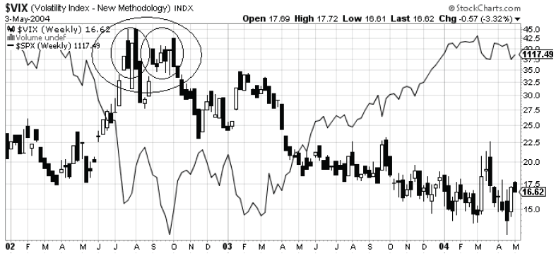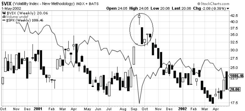 2002 sería el fin del mercado bajista iniciado en 2000. Ese momento final vendría acompañado por una gran suspicacia por parte de los inversores que veían atónitos como Enron y Worldcom, las cuales se consideraban buenas empresas, no eran más que unos chiringuitos. El pánico final de ese mercado bajista coincidió también con una lectura del VIX sobre 40. Después de eso, la alta volatilidad se disiparía y el mercado encontraría suelo para subir durante 5 años seguidos: