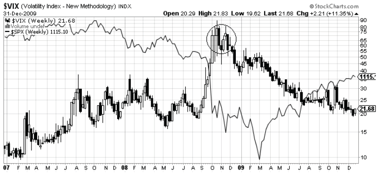 En 2008 nos trajo el mayor de los crashes, guinda final para un gran mercado bajista. Poco hay que añadir ya que todos recordamos lo que ocurrió. En este caso el VIX no se frenó sobre 40 sino que llegó a 90. Se trataba de un evento realmente extremo: