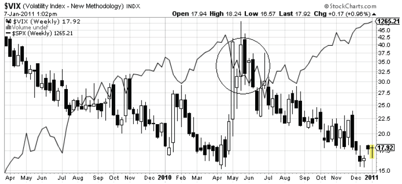 En 2010 la amplia mayoría pensaba que íbamos a entrar en una recesión doble. No ocurrió. El mercado hizo suelo y siguió desarrollando la tendencia alcista que ya traía. El VIX subió sobre 40, pero pronto se disiparía todo ese miedo a medida que el mercado se estabilizaba: