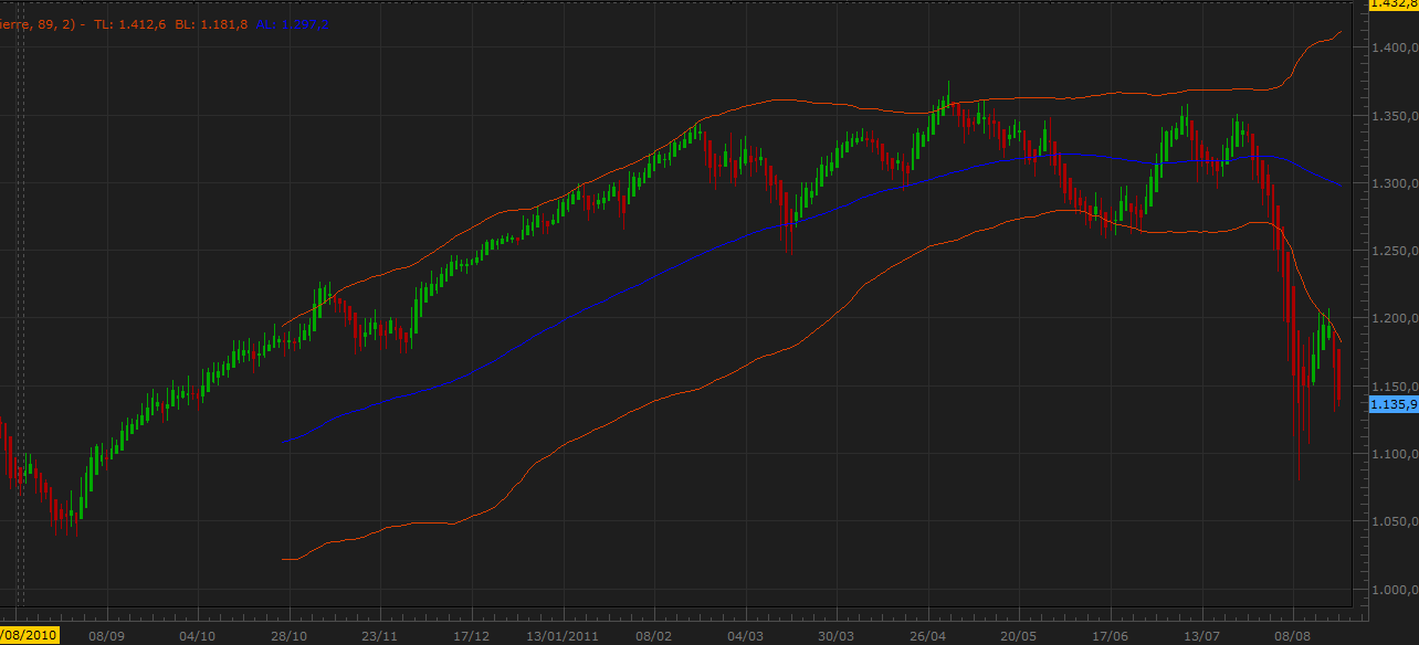 Fíjense que el precio ha formado un pullback en la Banda de Bollinguer 89 sin llegar a entrar realmente en ella. Cuando esto ocurre se corre el riesgo de ver una caída mucho más profunda y una volatilidad más alta, o dicho de otro modo corremos el riesgo de un "fast market". Bueno en realidad ya estabamos dentro de esa categoría pero quería usar la palabra :-)