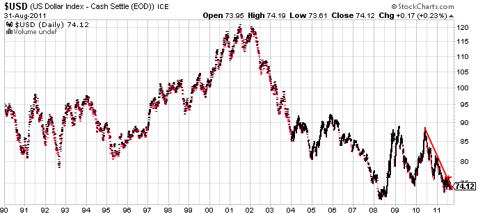 Por cierto, hablando de devaluación del dólar y el fin del imperio, es curioso que desde el 92 el dólar apenas esté un poco más abajo.