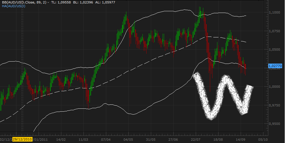 Se observa un potencial doble suelo en formación. Lo de potencial es por que aún no ha aparecido una vela verde alcista. Así que el aviso va con tiempo. Una vez salga esa vela es un doble suelo de libro. Además, el dolár australiano contra el dolar americano tiene a favor un fuerte diferencial de tipos de interés que hace que tu tendencia de largo plazo sea al alza. De hecho, sería bastante raro que rompiera esa banda de bollinguer 89. Un stop por debajo del mínmo presente (no el anterior de agosto) sería suficiente.