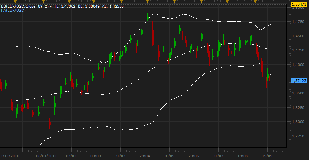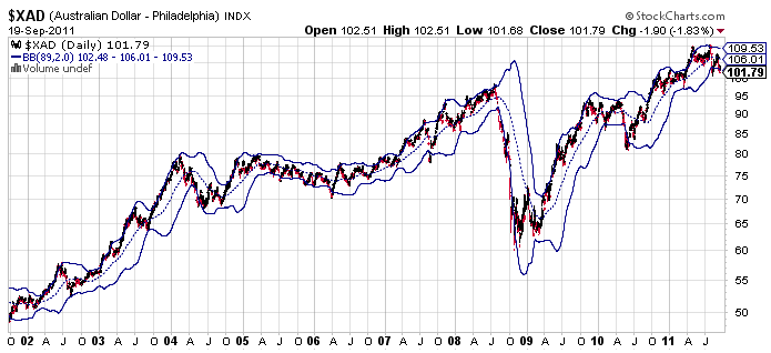 Mirad el gráfico del AUD a 10 años. Solo rompe las BB89 una vez, en 2008. Normalmente el dólar australiano fluctúa suavemente dentro de las bandas y siempre son una ligera tendencia al alza debido al fuerte carry trade sobre los activos australianos.