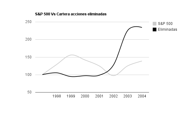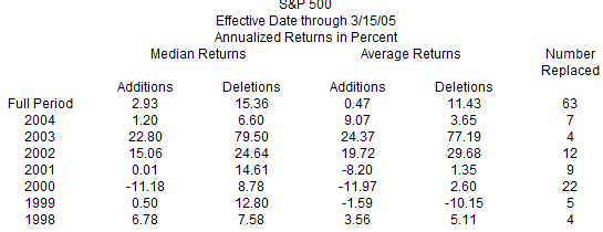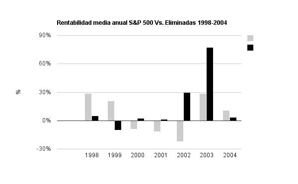 El estudio de Hussman Funds no es desde luego muy amplio (1998-2004) pero las diferencias tan abismales entre las acciones que son incorporadas (additions) a un índice y las acciones que son sacadas (deletions), nos hace preguntar que diferencia hay entre el retorno de las eliminadas y el conjunto del S&P 500.