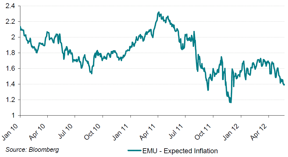 Sin embargo, aun cuando sigo sin ver valoraciones atractivas a largo plazo, el hecho de ver a los tertulianos de los programas del corazón hablar de la posible salida de España del euro, me incomoda mucho. Este fin de semana he visto a amigos míos hablar de lo mal que está la bolsa, de lo alta que está la prima de riesgo y de la probabilidad de que España salga del euro. Muchos han sacado sus depósitos de lo bancos (especialmente Bankia, claro) y algunos comentaristas internacionales llevan ya tiempo hablando de un bank run en España. Sin estar, por tanto, en niveles tan sangrantes como los de 2009, el sentimiento negativo es evidente. Todo esto empieza a dar un cierto tufillo a intervención. Desde luego, las expectativas de inflación no van a ser ningún impedimento para ello, como podemos ver en el gráfico siguiente.