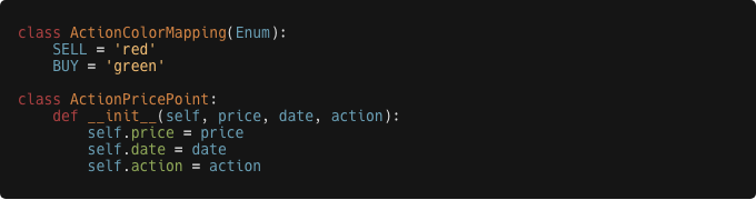 Usaremos ActionColorMapping solamente para propósitos de visualización que veremos más adelante. Por otro lado, instancias del tipo ActionPricePoint encapsularán los datos sobre posiciones a tomar en momentos específicos del tiempo.