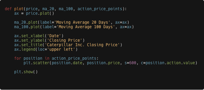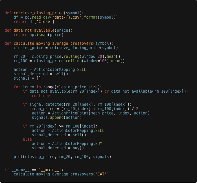 Nuestro programa comienza con la ejecución del método main. Ahí es donde llamamos a la función calculate_moving_average_crossovers pasando como parámetro el símbolo por el cual queremos operar. En este caso hemos pasado CAT, por la empresa americana Caterpillar Inc.
