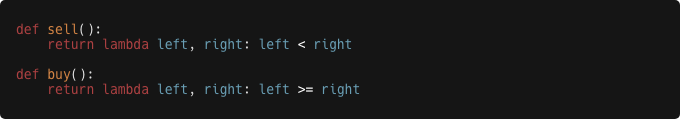 A continuación vamos a escribir dos funciones de orden superior (funciones que retornan funciones, comúnmente llamado expresiones lambda), una para evaluar si estamos en condiciones de vender y otra que evalúa si estamos en condiciones de comprar:
