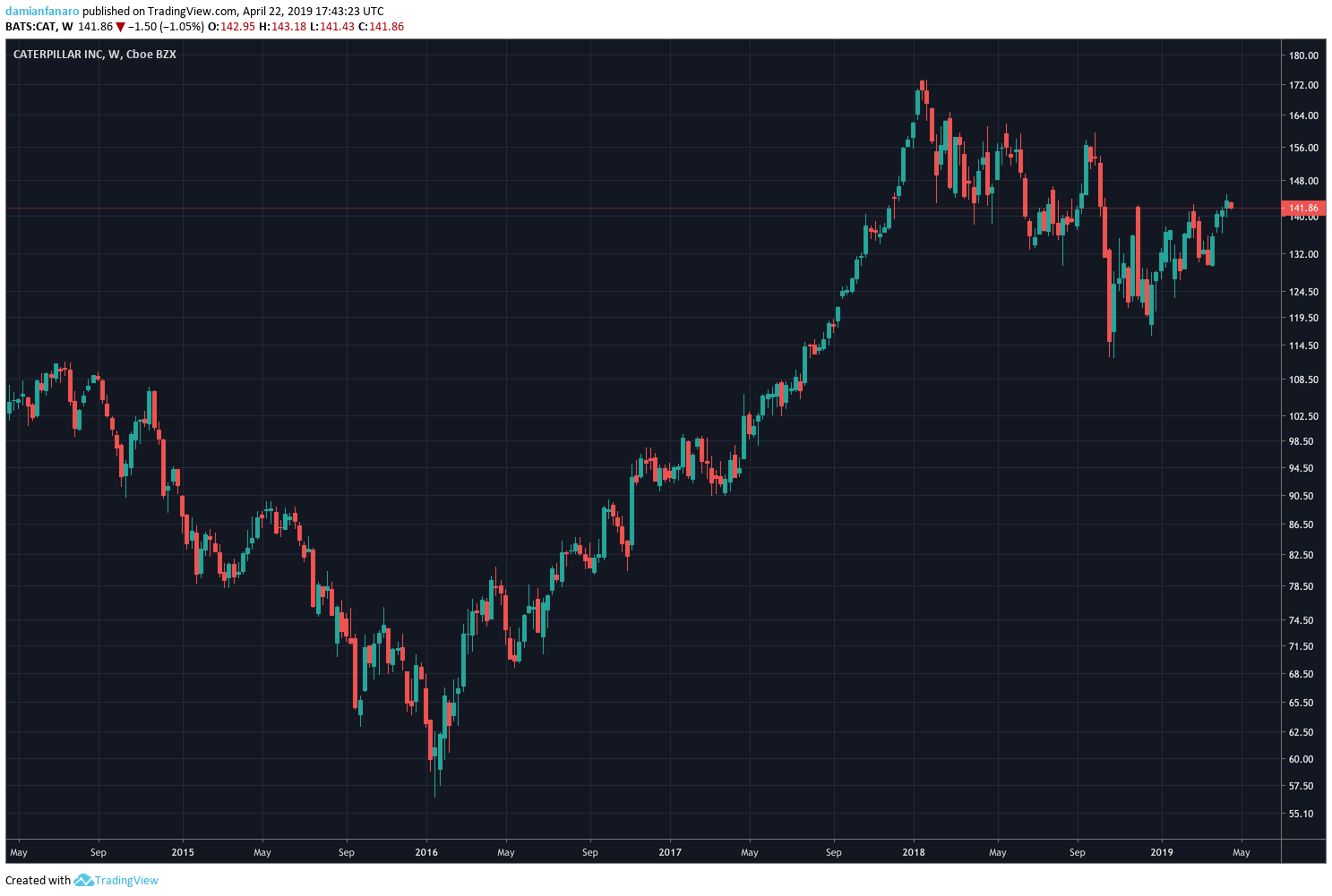 Comencemos con un ejemplo básico de una estrategia de trading. Imaginemos que queremos invertir en la empresa estadounidense Caterpillar Inc.