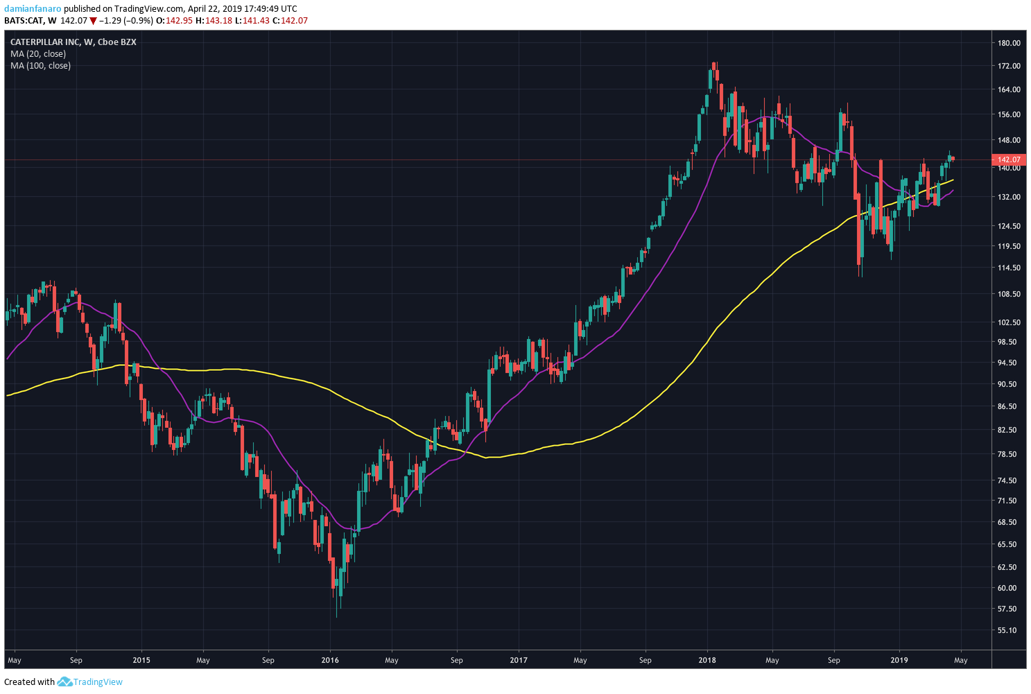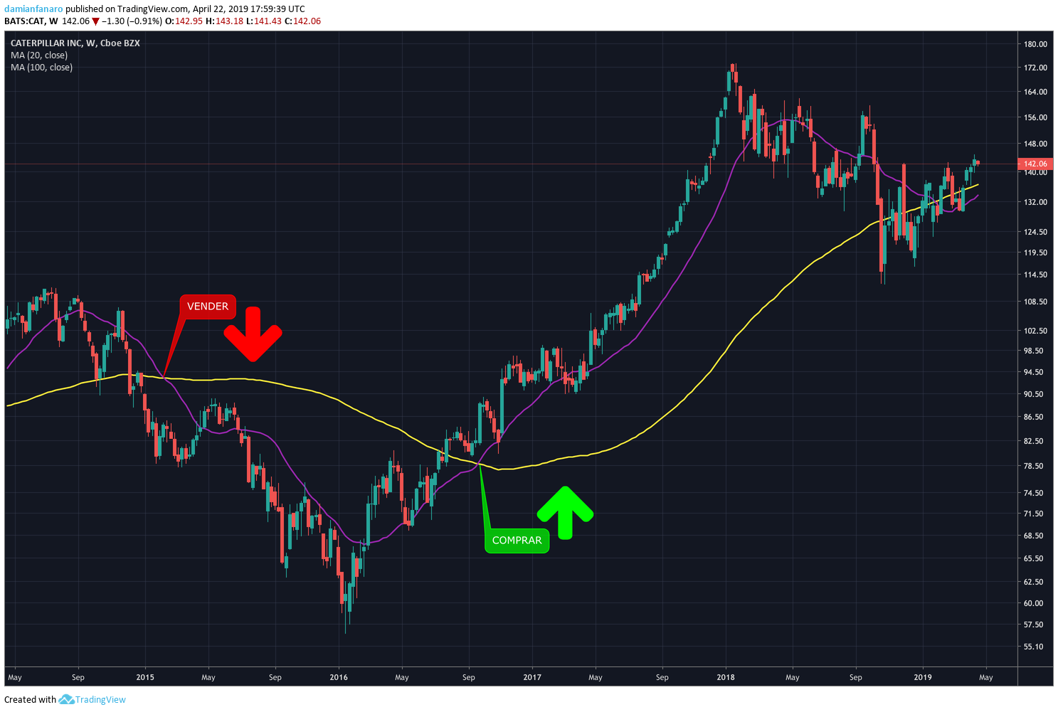 En la siguiente imagen, vemos nuevamente la cotización de Caterpillar Inc. con su histórico de 5 años, pero ahora con dos líneas adicionales. La púrpura representando la media móvil de 20 días y la amarilla siendo la de 100 días: