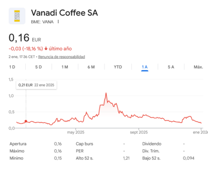 Podemos concluir con ese gráfico que Vanadi Coffee pasó a mejor vida, no fueron el Starbucks español, fueron una trituradora de valor y los amigos de CNMV y BME que permitieron que saliera a cotizar a 3.28 unos irresponsables, incapaces o farsantes, pero bueno si ya lo sabemos, nada nos extraña de esos entes.