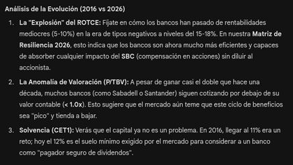 Le he preguntado qué es lo más probable para estos bancos en el próximo año teniendo en cuenta el entorno macroeconómico esperado (me hace el resumen de los dos más rentables, según ella, claro):