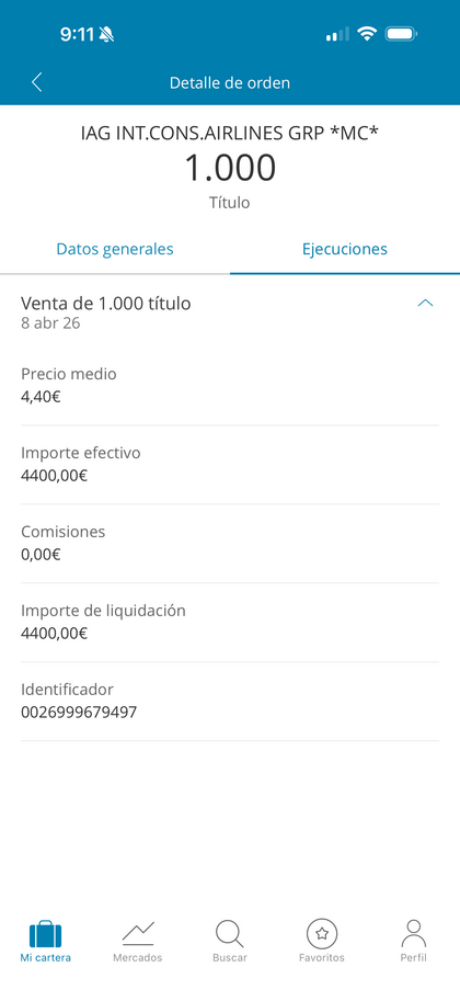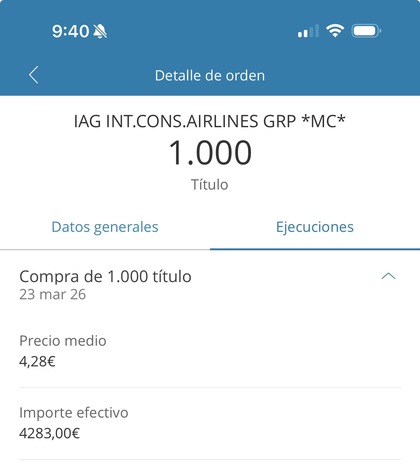 El caso es que la cosa salió mal, lo que tenía que ser una operación de compra y venta y cumplir con el bróker de caixabank se convierte en una pillada y la acción baja, pero estos días estalló la paz y en subasta de apertura ya veía que podía salir de IAG y sacarme unos euros y cumplir.