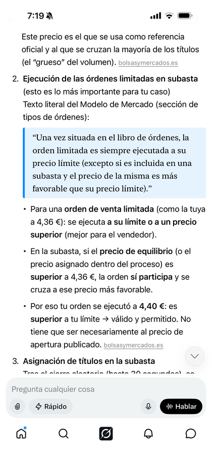 Este tipo de operaciones las he hecho con otros brokers y las ordenes me las cruzaron al precio de apertura oficial pero hoy no ha sido así, está claro que la orden no era “a mercado” si hubiera puesto eso se habrían cruzado a 4.56, pero se han hecho a 4.40 y eso ha sido porque la orden era limitada a 4.36.