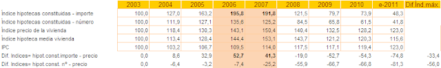 Esto nos podría llegar a hacer pensar que el precio de la vivienda está "inflado", pues a finales de 2011 el índice de valor de una vivienda fue de 123 y mantenía un diferencial con el índice de hipotecas constituidas en importe de 74,8pp.. Éste diferencial en 2007 era de 41,3pp. (1)