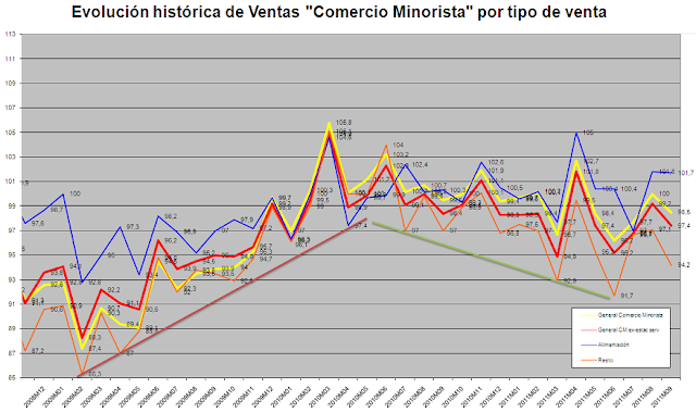 Estos datos se han extraído de la evolución anual a “precios corrientes” ( sin deflactar con IPC ) del Índice de Comercio al por Menor ( ICM ) a Sept’11 publicado por el INE ( base alimentaria, no-alimentaria y estaciones de servicio ). Los números expresados para cada mes hacen referencia al RH mes, es decir expresan cuál ha sido la evolución de las ventas de un mes frente al mismo mes del año anterior sin tener en cuenta el efecto calendario.