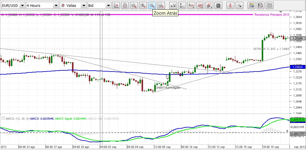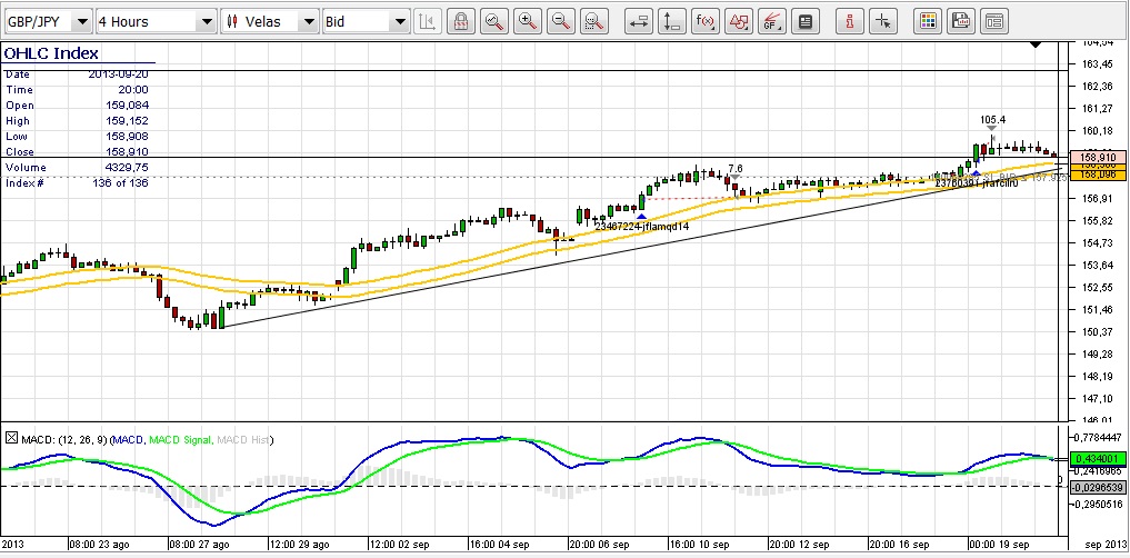 Este par de divisas lleva en tendencia ascendente desde finales de agosto y como ya avise esta semana se presentaba una oportunidad para poder sacarle al mercado unos cuantos pips. A pesar que teniamos abierta una operacion para EUR/USD y debido a la correlacion entre ambos pares de monedas no soy partidario de tener dos operaciones abiertas de forma simultanea pero ya que la operacion del euro estaba con ganancias decidi entrar en el mercado con dos lotes y la cosa fue bien ya que despues del anuncio de la FED este par tuvo una subida importante en la cual aprovechamos para cerrar la mitad de nuestros lotes y sacarle al mercado 168 pips, con el lote restante lo movimos a breakeven mas el spread y la operacion queda ya con ganancias y a la espera de ver que hace el precio. Como vemos en el grafico despues del impulso vino una correccion y actualmente estamos apunto de que el precio toque nuestro stop pero todavia no lo ha hecho y veremos como abre la semana confiando en que siga subiendo ya que tenemos un doji que nos da oportunidad de cambio de tendencia de la correccion. Si por el contrario toca nuestro stop y nos saca del mercado le habremos sacado a dicha operacion unos cuantos pips a nuestro favor como ya he comentado.