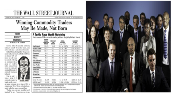 Pero Ekhardt es famoso por ser el socio de Richard Dennis, el socio matemático, el soporte lógico y de rigor del sistema de trading, en la creación de las tortugas ( the turtless), cuya historia se conoce y se ha escrito mucho sobre eso, y algunos artículos están traducidos al español. Ganaron en la década de los 80 con 20 novatos contratados un a media de un 80% anual con carteras cada uno superior al millón de dólares, operando el sistema de trading de tendencia creado por Dennis y Erchardt.