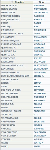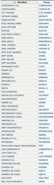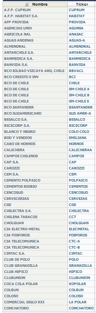 Las empresas que cotizan en el IGPA, con su ticker correspondiente, son las siguientes: