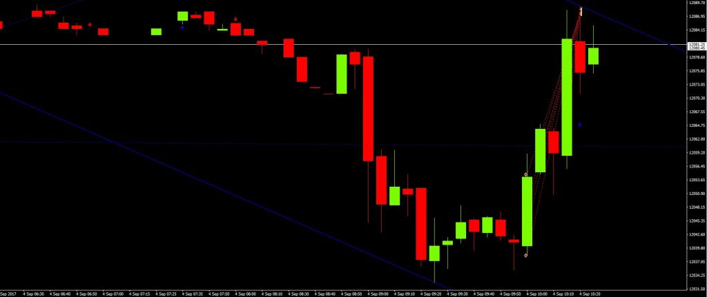 Y como una imagen dice más que 10.000 palabras, lo que le pasó a esta buena persona es que, efectivamente, se puso en corto y vendió (en el mercado que figura en el gráfico, en el Dax, pero también en otros varios...), "frotándose las manos" pensando que lo "lógico" era que el mercado bajara y bajara...y en pocos minutos, no solamente no fué capaz de cerrar esas operaciones de venta al ver cómo el mercado subía y subía, sino que por contra, se bloqueó completamente y lo que hizo fué "echar más leña al fuego", e incrementar su riesgo, su dolor y sus pérdidas: vender más y más contratos...