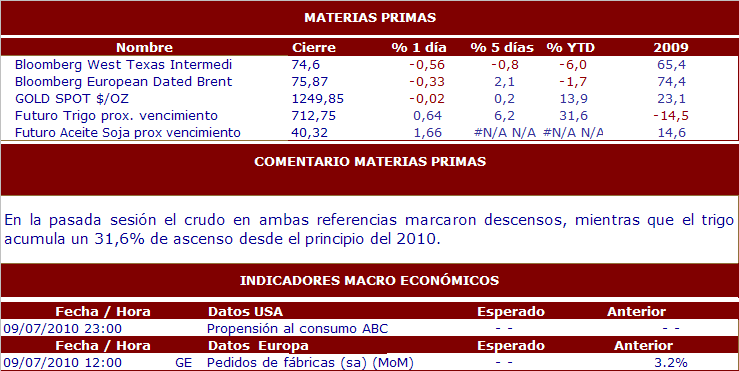 Ayer la Bolsa de Nueva York permaneció cerrada por la festividad del "Labor Day" y los mercados europeos, sin datos macroeconómicos de relevancia, vivieron una jornada muy tranquila y con un volumen de negocio muy escaso. El Presidente de EE.UU., Barack Obama, anunció ayer en Milwaukee las nuevas medidas que presentará en el Congreso antes de las elecciones legislativas de noviembre. Por un lado, Obama presentó un nuevo programa de infraestructuras para impulsar la creación de empleo con el objetivo es mejorar y ampliar la red de carreteras, los aeropuertos y poner en marcha el tren de alta velocidad y por otro lado, informó de la depreciación acelerada (en 1 año) de las inversiones hechas en 2011 (retroactiva para septiembre 2010). La sesión de hoy será escasa de referencias macro relevantes. En EEUU el único dato que se publicará es la Propensión al Consumo ABC, mientras en Europa conoceremos los Pedidos de Fábrica en Alemania y estaremos atentos a la reunión del Ecofin. Japón acusó la falta de medidas de apoyo al Yen por parte del BOJ.