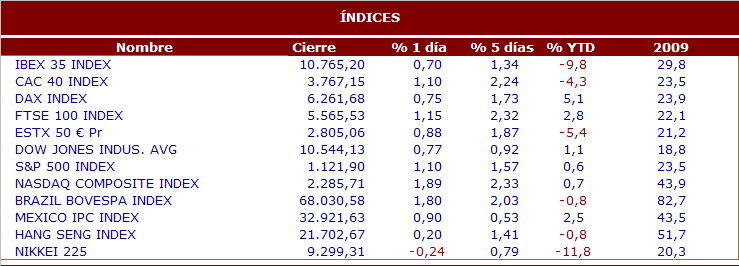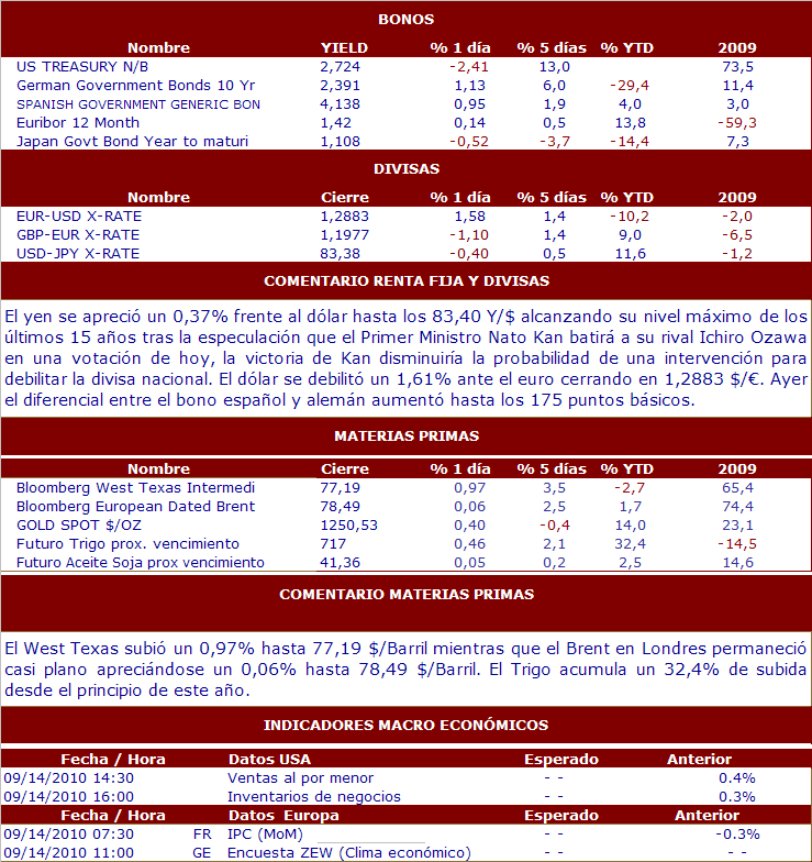Las bolsas occidentales han iniciado la semana con alzas, gracias a los buenos datos de Producción Industrial en China y los nuevos requisitos de solvencia para los bancos, que fueron acogidos con optimismo por parte de los inversores, cuando hoy se cumplen dos años de la quiebra de Lehman Brothers. Los bancos fueron los grandes protagonistas de la jornada y en Wall Street ayudó también la actividad de fusiones y adquisiciones, que tuvo como protagonistas a HP, Genzyme y Hertz. Ayer no se publicaron referencias económicas relevantes. Hoy en Europa estaremos atentos a la publicación de la encuesta ZEW sobre el clima económico y la situación actual en Alemania y en la UE y el IPC en Francia y Reino Unido, mientras en EEUU conoceremos los Inventarios de Negocio y las Ventas al Por Menor de agosto. Tendencia mixta en los mercados asiáticos, con el Nikkei japonés que perdió un 0,24% debido a la caída de las compañías exportadoras que han vuelto a verse perjudicadas por la fortaleza del Yen.