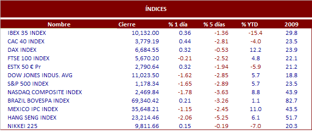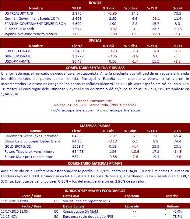 Jornada la de ayer en rojo para todos los índices europeos y americanos con caidas entorno de mas del 2% para la mayoria de índices europeos. En españa el Ibex 35 cerró perdiendo un 2,52%, la mayor caída desde hace tres meses, perjudicado como todos los demás índices por las dudas sobre la solvencia de Irlanda y el temor a que China suba los tipos de interés y de forma particular por las ventas en el mercado de deuda con la subasta de letras a 12 y 18 meses en las que se tuvieron que pagar intereses de mas del 2,4%. Ayer tras la reunión de los ministros de finanzas europeos se anunció el envío de una misión técnica conjunta con el FMI y el BCE a Dublín para concretar los términos de una eventual ayuda al sector bancario. Mientras el mercado estadounidense cerró su peor sesión en un mes con una caída que durante gran parte de la sesión fluctuó cerca del 2%, motivada tambien por las dudas entorno a Irlanda y China, mas aun cuando Corea del Sur subió en la jornada de ayer los tipos hasta el 2.5%. La buena noticia del día en el mercado americano la dieron los resultados de Home Depot y Wal-Mart. En cuanto a datos macro,ayer conocimos en Europa IPC de la eurozona del mes de octubre 0,4% vs 0,3% y en Alemania la Encuesta ZEW (Clima Económico) cuyo índice se situó en 81,5 vs 75 esperado. En EE.UU. conocimos la Producción Industrial del mes de Octubre se mantuvo plana 0% vs. 0.3% esperado y el índice de Precios al Productor también del mes de octubre subió un 0.4% frente al 0.8% esperado por el mercado. Hoy estaremos atentos, en Europa a las Construcciones Mensuales en la Eurozona y en EE.UU. a las Solicitudes de Hipotecas MBA, al Índice de Precios al Consumidor (MoM) y al dato de las Construcciones Iniciales de Viviendas.