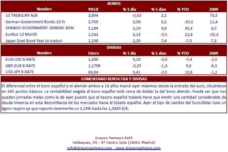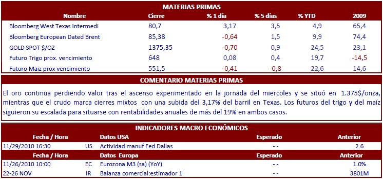 Ayer, pese a que la mayoría de los índices europeos cerraron en positivo, el devenir del Ibex fue el que nos tiene acostumbrados últimamente, inicios con aires de jornada de definitiva caída para entrada la tarde empezar a moderar perdidas. El efecto contagio es una realidad. Ayer la prima de riesgo española alcanzo su máximo histórico desde la entrada del euro situándose en 245 puntos básico, doblando el interés ofrecido por los bonos alemanes que se situó en 2,7%. Además, el tesoro español tiene aún pendientes varias emisiones: los días 2 y 16 de diciembre se emite deuda y los días 14 y 21 de diciembre se hará lo propio con letras. Entre otros factores, el anuncio de Axel Weber miembro del consejo de Gobierno del Banco Central Europeo, en el que dijo que de ser necesario se incrementaría el presupuesto del mecanismo de rescate de la UE, no espoleó la confianza de los mercados sino que la minó. Estas declaraciones fueron interpretadas por los mercados como que en caso de ser necesario un rescate a España, este sería posible. Además del selectivo español, el resto de bolsas de los países periféricos también terminaron la jornada con pérdidas, a diferencia del Dax alemán, el CAC 40 francés o el Ftse Británico, que escapan a la crisis actual. Ayer también conocimos el anuncio de que a principios de año se volverán a realizar test de stress a la banca europea y no solo de solvencia, sino también de liquidez y parece que este anuncio ayudo a los bancos puesto que su comportamiento mejoro a partir del anuncio, BBVA y Sabadell cerraron en positivo, Santander en plano y Banesto, Popular y Bankinter cerraron en perdidas. En cuanto a los datos macro, hoy estaremos atentos al Ratio Anual de Crecimiento en la Eurozona. Cabe recordar que en la jornada de ayer Wall Street permaneció cerrada por el día de Acción de Gracias.