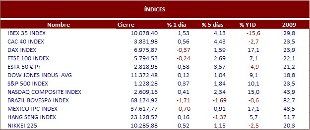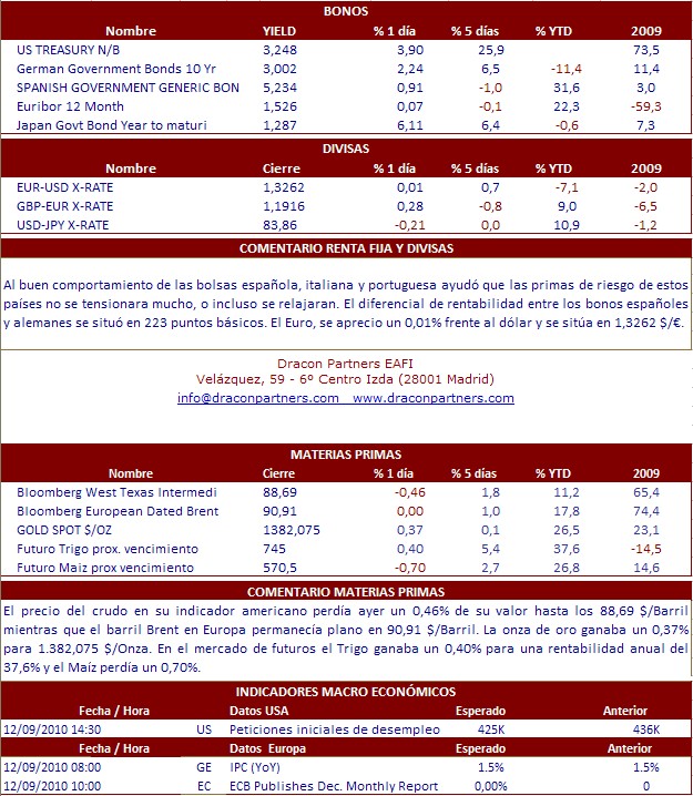 Ayer el Ibex celebro también el día de fiesta y cerro con subidas superiores al resto de plazas europeas para recuperar los 10.000 puntos. El CAC francés no fue capaz de celebrar el aumento del 0,1% de la previsión de crecimiento del Banco Central francés para el cuarto trimestre del año. Por su parte el DAX alemán, el índice más rentable en Europa con una rentabilidad anual del 17,1% no fue capaz de superar el mal dato de las exportaciones que cayeron un 1,1% en octubre frente a la esperanza de los analistas de que se mantuvieran estables. En el Ibex 35 una vez más los protagonistas fueron los bancos, encargados últimamente de hacer caer el selectivo español, pero también responsables de levantarlo. Sabadell +3,14%, BBVA cerca del 3% y entidades como Bankinter, Banesto o Santander con subidas de más de un 2%. Las entidades españolas recibían así la noticia de la confirmación de los test de stress para todos los bancos europeos el próximo año. En EEUU una fuerte volatilidad dominó la sesión de ayer en la que la posibilidad de una subida de tipos en China y el anuncio del Presidente Obama, de que la rebaja de impuestos que ideó George Bush se prolongará durante dos años más mantuvieron agitado al mercado en un día sin apenas datos macro económicos. Desde el punto de vista macro económico en Europa estaremos atentos al informe mensual de BCE y en EEUU a las Peticiones Iniciales de Desempleo de la semana pasada. En Asia, los mercados han cerrado positivos a pesar de las dudas provocadas por la decisión de las autoridades chinas de adelantar dos días la publicación del dato de inflación correspondiente al mes de noviembre. El mercado conocerá la estadística de precios el día 11 de Diciembre, fuentes de mercado aseguraban que el Banco Central chino subirá los tipos de interés al tiempo del anuncio del dato del IPC, de ahí las dudas de los mercados.