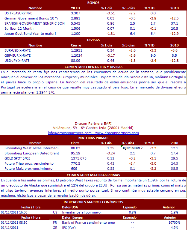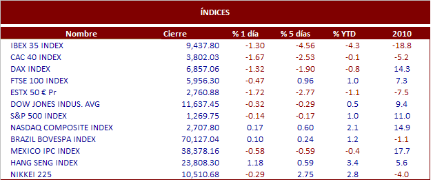El comienzo de la jornada de ayer nos hizo temer lo peor, nada mas comenzar los indicadores Español y Portugués perdían mas de un punto porcentual, muy por encima de las perdidas en el resto de Europa. Las pérdidas se moderaban a media mañana y en el mercado comenzaba a circular el rumor de que el Banco Central Europeo estaba comprando deuda de los países afectados. Seguramente, las compras por parte de la autoridad monetaria Europea iban mas enfocadas a la deuda portuguesa que a la española. En el mercado, también se comentaba que Angela Merkel y Nicolás Sarkozy estaban presionando a su homologo portugués para que aceptara lo antes posible un rescate a su economía y así calmar los ánimos. Según algunos analistas Portugal deberá pedir el rescate en el primer trimestre del año y para España la fecha marcada en el calendario será mayo debido a los importantes vencimientos en deuda a largo plazo. Otro de los países que ayer sufrían con las presiones del mercado fue Bélgica, el país está sumido en una gran inestabilidad política y se encuentra sin gobierno desde el mes de abril, su prima de riesgo aumento un 0.08%, aunque todavía se encuentre en niveles muy moderados de 135 puntos básicos. Al final de la sesión el Ibex perdía los 9.500 puntos -1.29%, aunque hubo índices con peor comportamiento ayer como el de Milán, Bruselas, Paris y Lisboa.La Bolsa de Nueva York comenzó la semana de la misma forma que terminó la pasada, y sufrió, aunque menos que las bolsas europeas, los problemas de deuda del viejo continente. Da la impresión de que los inversores americanos está a la espera de ver como se resuelven los problemas de deuda en Europa y las subastas que tendremos a lo largo de esta complicada semana. Desde el punto de vista macro, en EEUU hoy estaremos atentos a los Inventarios al Por Mayor de noviembre, donde esperamos avancen un 1%, frente a la subida del 1.9% del mes anterior, así como a los datos de Propensión al Consumo y la encuesta sobre Optimismo Empresarial de Diciembre.