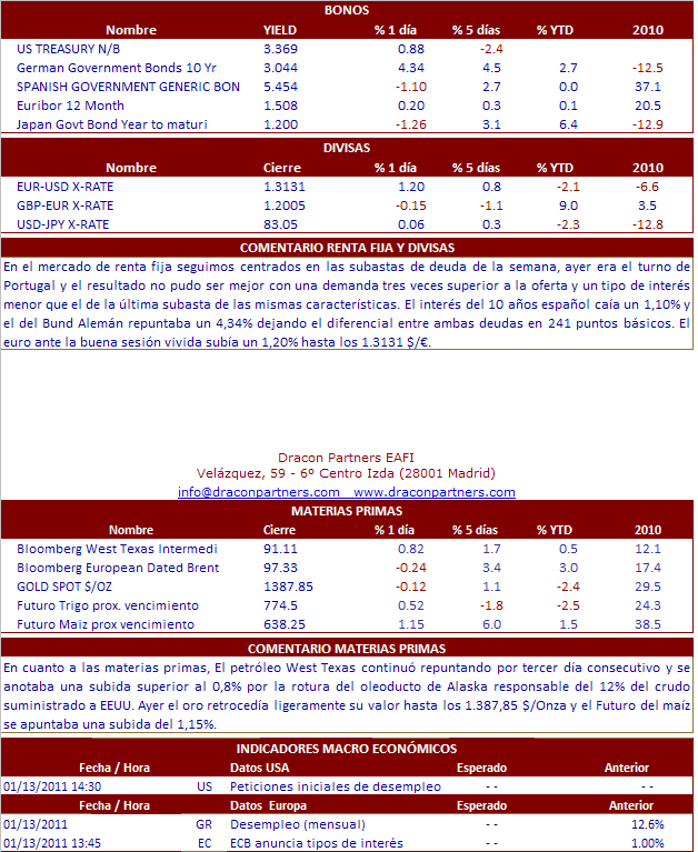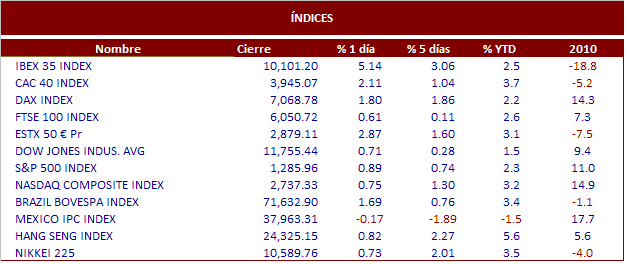 Ayer fue una jornada bursátil a la que se le tenía mucho respeto a priori, ya que se celebraba subasta de deuda en Portugal, y además se llevaba días señalando que el fondo de rescate europeo no iba a ser suficientemente grande para rescatar a España si fuese necesario y que eso haría quebrar al Euro. Todo cierto. Pero pronto se vio que las cosas iban a salir de cara, a través de filtraciones y declaraciones de que la subasta saldría finalmente bien y que se estaba sopesando aumentar el citado fondo de rescate. Traducción, cierre de cortos y fortísimas subidas en las bolsas que en el caso del Ibex fue superior al 5%, con el sector bancario a la cabeza y con el BBVA y el Santander rozando el 10% de subida. Las buenas colocaciones de deuda celebradas en Grecia, Italia y Portugal durante la semana allanan la subasta de España, que se celebrará hoy. En EEUU, el optimismo en Europa le llevó a su nivel más altos en los últimos dos años, si bien las alzas no fueron tan abultadas como en el viejo continente. En el plano empresarial, hoy habrá que estar muy atentos a la publicación de resultados de Intel y mañana viernes con el banco JP Morgan. La publicación de libro Beige de la Fed puso el broche final a una buena sesión en Wall Street, al decir que el mercado laboral, una de las asignaturas pendientes para qué la recuperación económica americana sea un hecho, daba indicios de mejoría. Como datos macro en EE.UU. Hoy tendremos que estar muy atentos a los Precios a la Producción Industrial de diciembre y a las Peticiones de Subsidio de Desempleo. En Europa, ayer conocimos la Producción Industrial de la Eurozona 7,4% vs 5,9% esperado. Hoy el BCE anuncia tipos de interés. En Asia, las bolsas asiáticas han cerrado con avances, destacando el Nikkei con una subida del 0.73%.