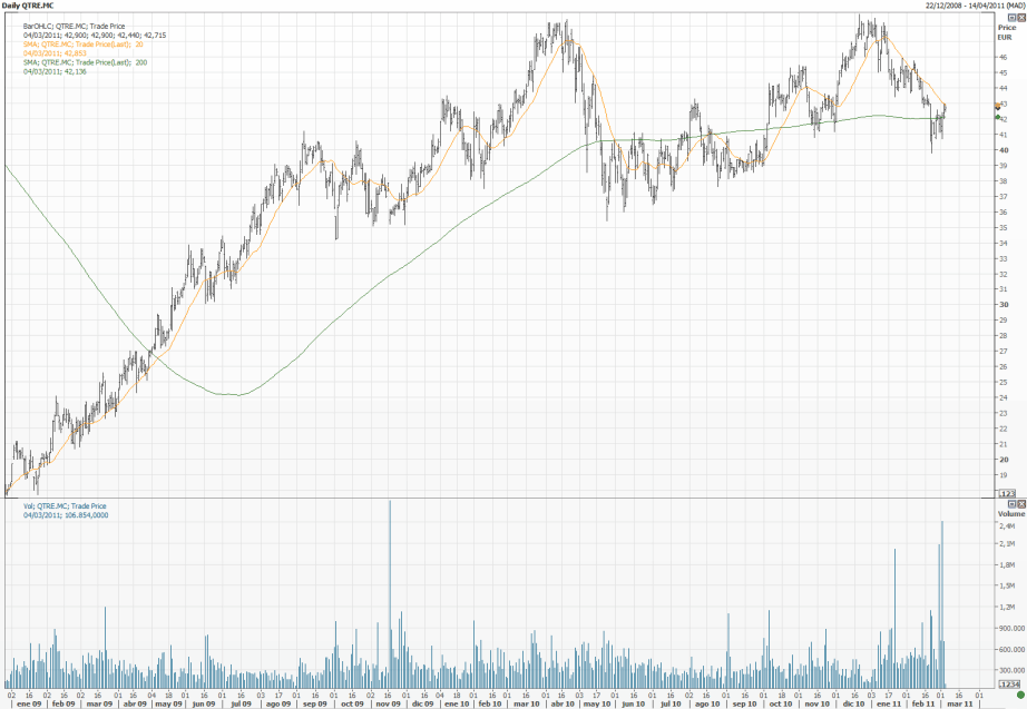 Durante los últimos días hemos visto volúmenes muy importantes en la zona inferior del rango lateral 38-48 EUR, con acumulación de posiciones en la acción, zona que coincide con la zona de la media de 200 sesiones, que tomaremos como stop de referencia, actualmente en 42 EUR. La continuidad del movimiento le da un primer objetivo en 46 y 48 EUR antes de marcar nuevos máximos en los próximos meses por encima de dichos niveles, con un objetivo para 2011 de 54 EUR.