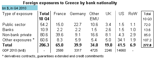 Exposición de los bancos europeos a Grecia (fuente: datos del BIS a final del cuarto trimestre de 2010 en miles de millones de dólares):