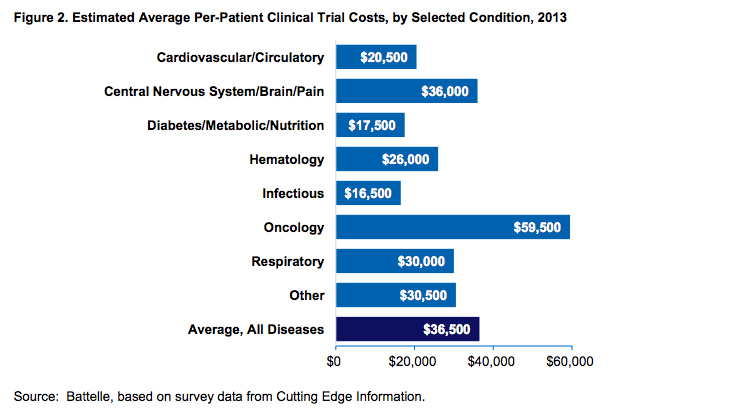 Para que nos hagamos una idea aproximada de cuanto gastan las compañías Biotech en sus ensayos, aquí abajo tienes una serie de gráficos que muestran los costes aproximados por persona que participa en el estudio, y también los costes según el campo concreto de investigación, tanto por persona como por patología estudiada y fases.