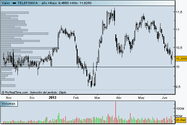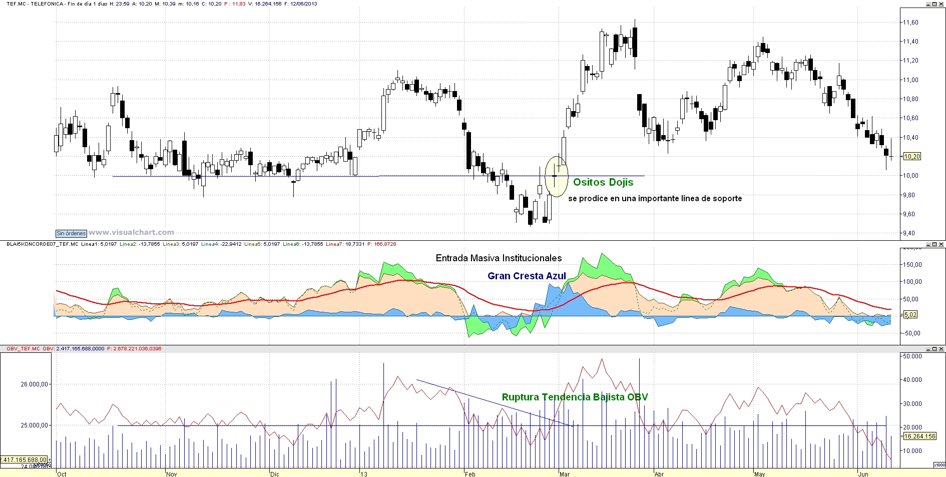 Tele-Afónica, quien sino, tras una larga caída durante el primer trimestre de 2.013, reunió los 3 ingredientes de la cestita Bajista cuando aparecieron los 2 Ositos Dojis en una importante zona de soporte; gran cresta azul en Konkorde que indicaba la entrada masiva de manos fuertes, ruptura al alza de la tendencia bajista del OBV seguido de un incremento del volumen de compra, y, rebote en la ultima línea de la cama elástica (ultima gran barra del volumen por cotización)