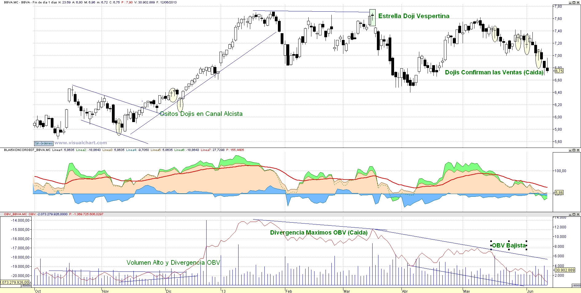 . Volumen + OBV; servirá para identificar claras divergencias que indiquen una señal de entrada. No obstante, será mas relevante el volumen generado tras la aparición del Osito Doji que deberá superar ampliamente la media mensual de las ultimas 20 sesiones.