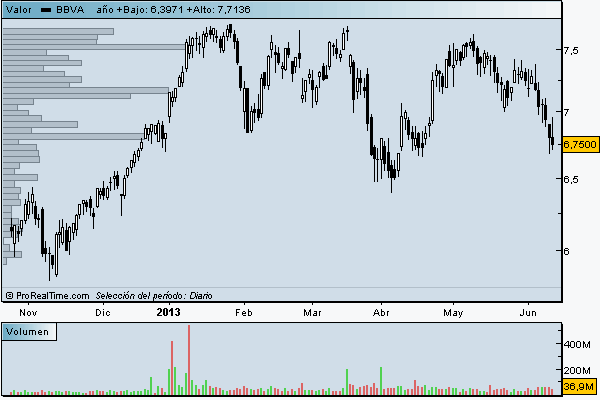 . Volumen por cotización; indica la cantidad de títulos que se negocian en un precio determinado. Podéis consultar como funciona este indicar en la siguiente entrada. En esta estrategia nos servirá para descubrir los rellanos de la escalera, es decir, donde se detiene a descansar el precio.