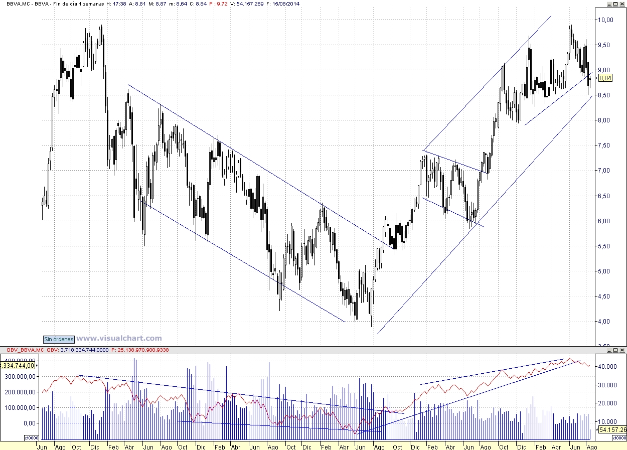 A principios de 2.010, BeBeuVA confirmó el inicio de una tendencia primaria bajista, que, duró aproximadamente dos años y medio, hasta Septiembre de 2.012 concretamente. En esta fecha, la cotización rompió al alza la directriz bajista, y, la tendencia del OBV pasó a ser alcista. El rango de precio para la cotización se estableció entre 5 y 10 €.