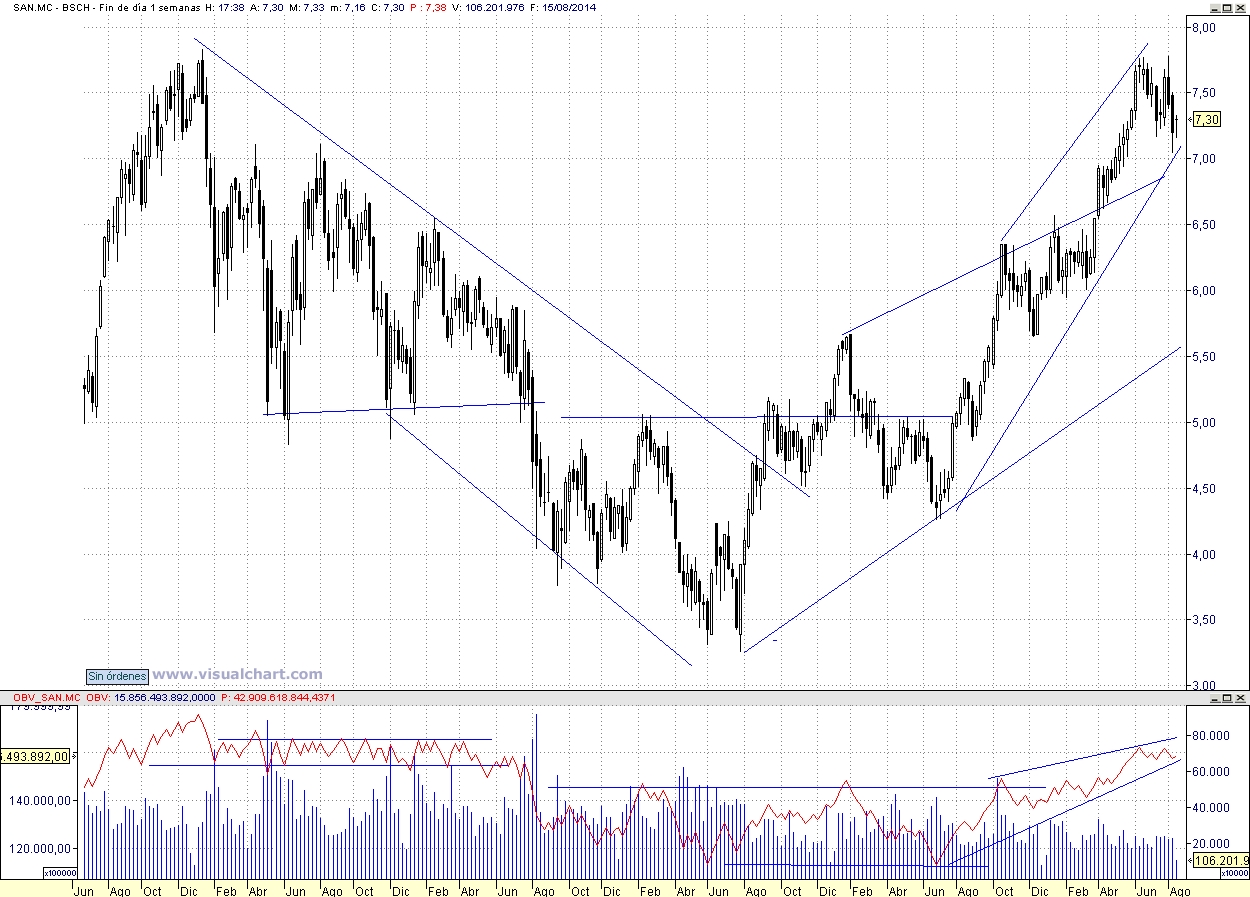 En primer lugar, habréis observado que hemos fotografiado un grafico semanal de los últimos 4 años, donde, se definen claramente dos tendencias primarias, una bajista y otra alcista, en este orden concretamente. No es casualidad, sino causalidad, que, cada dos años BeBeuVA y SantoAndres repitan están tendencias cíclicas, el motivo, la expansión y contracción crediticia que practican, es decir, manipulan la oferta monetaria a su mas lucrativo antojo (Carry Trade (bancarizar territorios a través de la odiosa deuda publica), Financiarización de la economía (sistema fraudulento de tarjetas de crédito), Reserva Fraccional (préstamos creados de la nada con usura practicada), etc.)