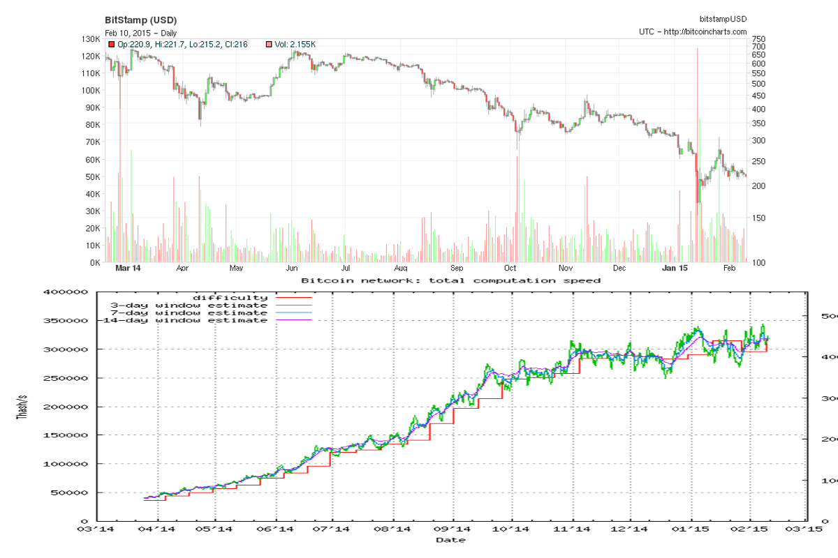 Por ejemplo, tras la ruptura a la baja del triángulo formado entre los meses de Octubre y Diciembre del año 2.014, el poder computacional de BitCoin subió de 250.000 TeraHash a 350.000, es decir, aumentó un 40 % mientras que el precio del BitCoin tambien cayó en la misma proporción, pasando de 350 $ a 175 $. Sin embargo, alcanzó el precio de 200 $ inmediatamente, ya que, este valor es un nivel muy vigilado en la comunidad BitCoin.
