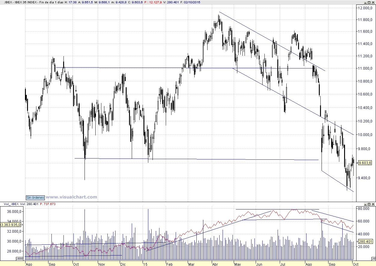 Nuestra apuesta predice un rebote del índice hasta los 9.800, incluso hasta los 10.000 puntos, y, una fuerte caída hasta los 8.700. Obviamente, si la cotización supera con fuerza la actual directriz bajista situándose la misma por encima de los 10.000 puntos, hasta los 10.500 puntos puede alcanzar el índice. Que mas da finalmente hacia donde se dirija, no importa, ganaremos dinero con cualquiera de las direcciones previstas.