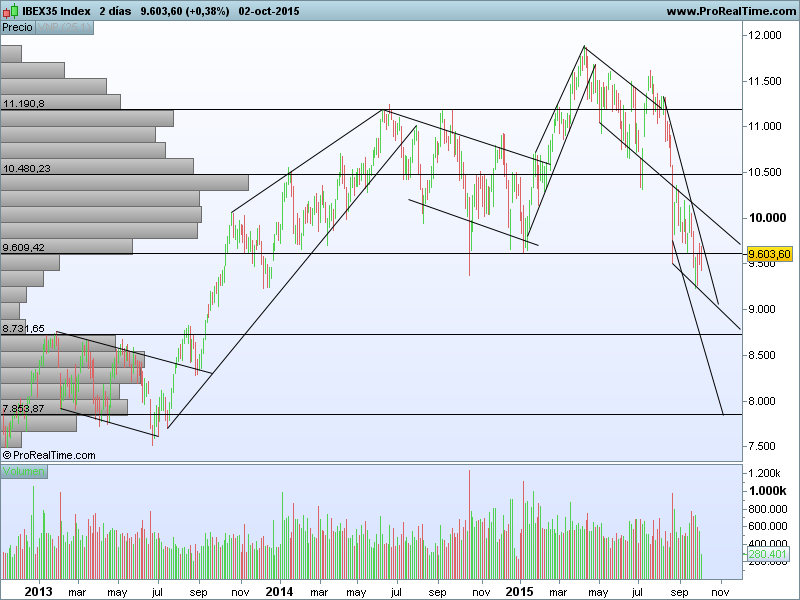 Los anteriores gráficos diarios muestran un Ibex claramente debilitado, en el primero, la tendencia del precio y del volumen son convergentes, indicando una caída a medio plazo bastante convincente. En el segundo grafico, hemos marcado los niveles clave del volumen por cotización para descubrir hasta donde puede llegar la caída, y/o, rebotes que pueden suceder sobre la misma.