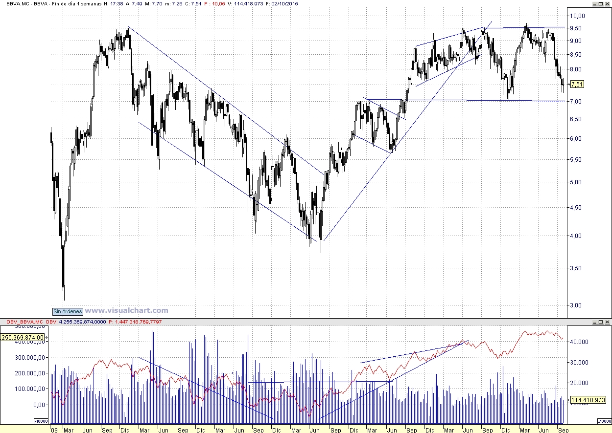 Bbva, parece ser que no caerá mas allá de los 7 €, a la tendencia del volumen nos remitimos, y, parece ser que el rebote alcanzará máximo los 8 euros. Alcanzar el anterior precio, supone un alza del 3-4 %, aproximadamente el rebote previsible para el Ibex. Por lo tanto, durante la caída previsible del 11 % tras el rebote, Bbva alcanzará de nuevo los 7 €. Respecto al techo, ¿esta claro no?, efectivamente, en 9,5 €