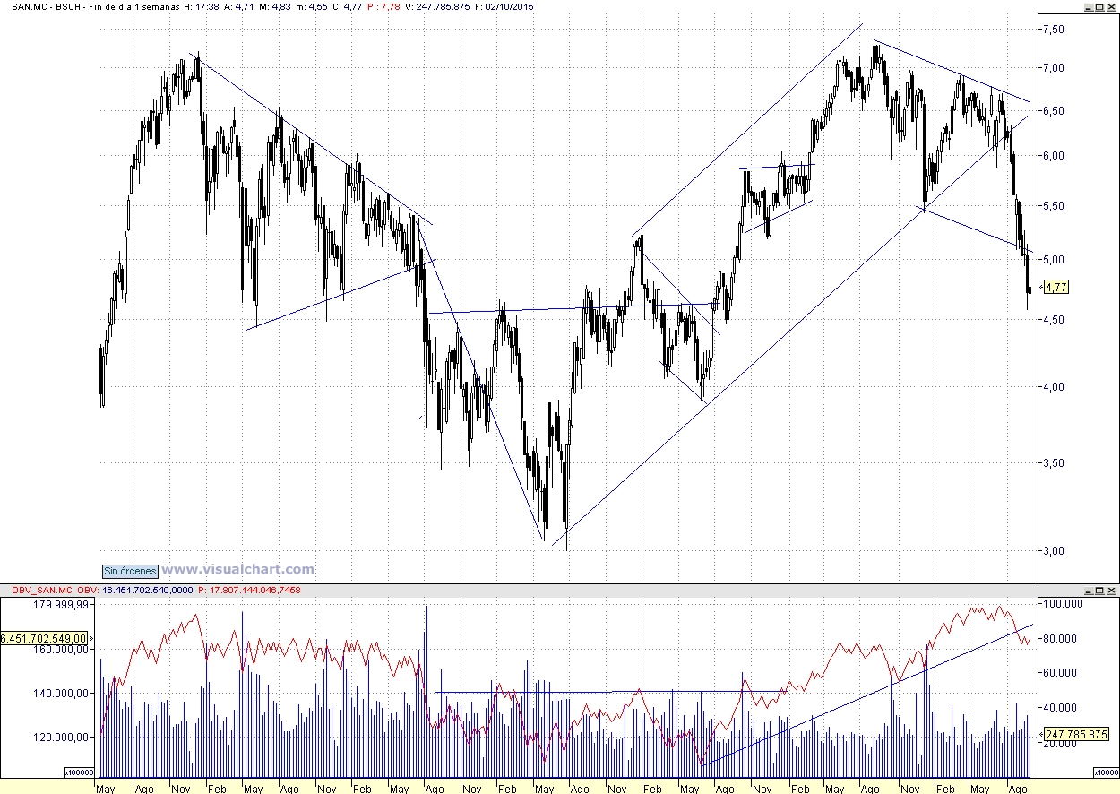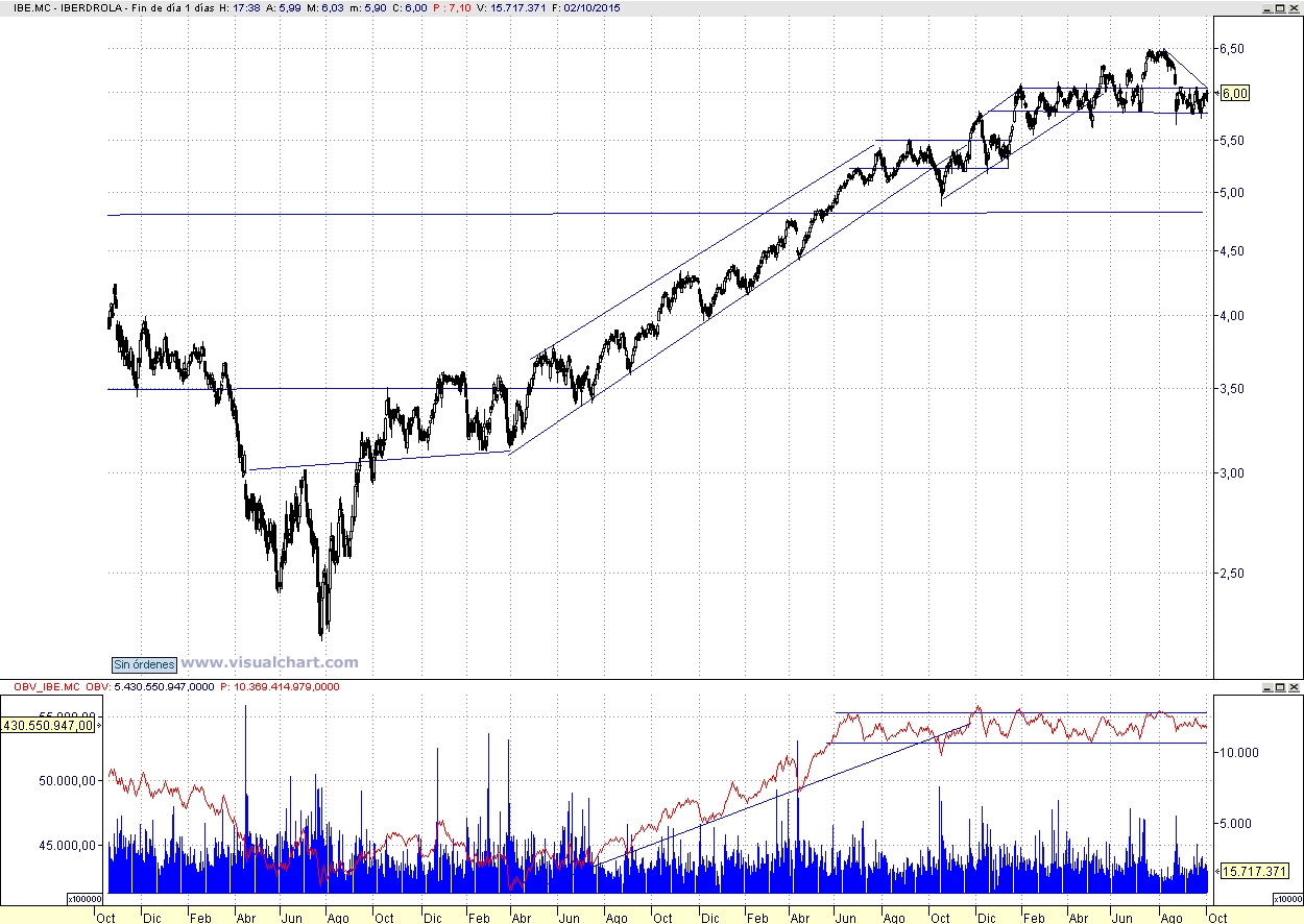 Iberdrola, como podéis observar en el gráfico a largo plazo, sigue en tendencia primaria alcista, alcanzando incluso nuevos máximos cuando el índice general caía. No obstante, ha formado un canal lateral incluso cuando el Ibex descendía, es decir, se ha comportado mejor que el índice. Ahora, la cotización se encuentra dentro de una gran vela maestra, que, marcó en 5,78 € un claro suelo, a las barras del volumen por cotización nos remitimos. La tendencia del volumen (OBV) cotiza lateralmente, pero, sin embargo la cotización ha alcanzado nuevos máximos, esta situación indica que el mercado sigue entrando en la compañía.