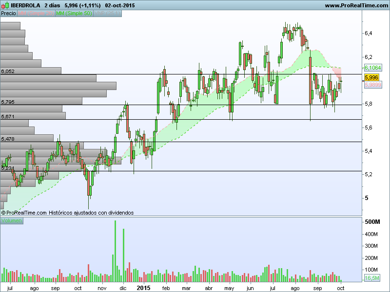 Para los que operéis comprando acciones, comprar a 5,47 €, y, venderlas de nuevo cuando alcance los 6,05 €. Es decir, operad sobre las barras del VPC, que, además os darán infalibles pistas.