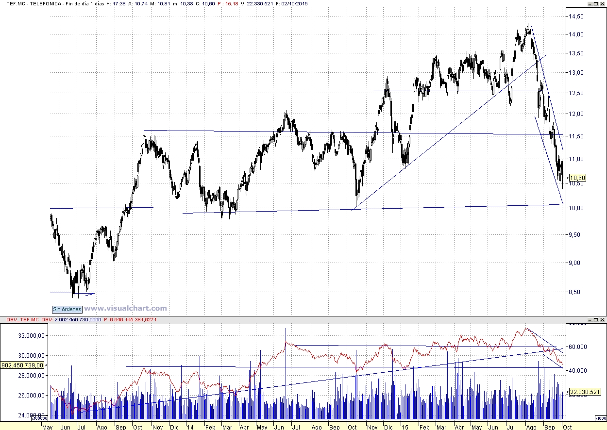 Telefónica, galopa verticalmente hacia abajo, perforando todos sus niveles referentes durante su travesía; 12,50 €, 11 €, ¿10 € será el próximo?. Sobre la afónica compañía no haremos pronósticos, a la tendencia del precio y del volumen nos remitimos.
