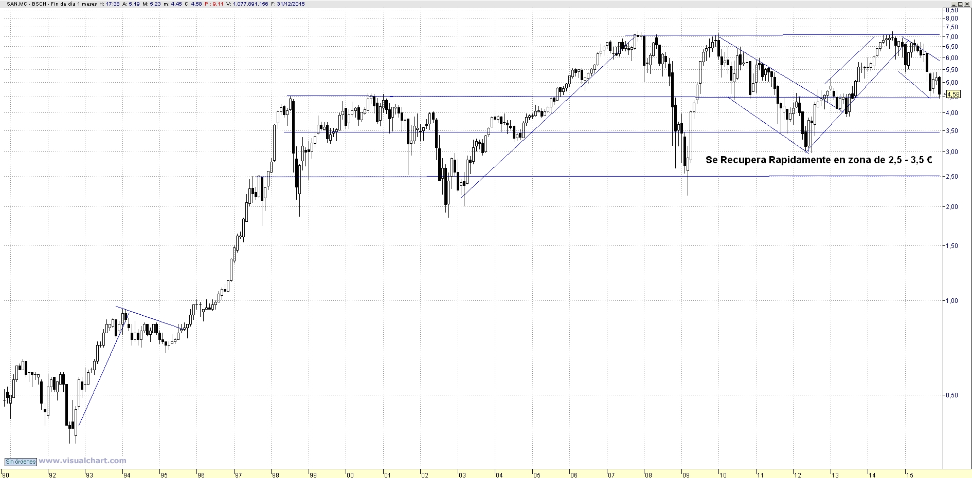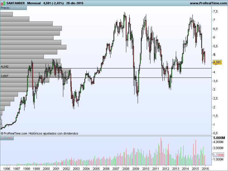 Sin tener en cuenta la década de los 90, para el gráfico mensual de la historia cotizada del Banco Santander, podemos observar que existen diferentes zonas de precio altamente frecuentadas: desde al año 2.002, la zona de 2,5 – 3,5 euros es un área donde el precio de la acción se recupera rápidamente, iniciándose además en este nivel todas las tendencias alcistas que se han producido hasta la fecha.