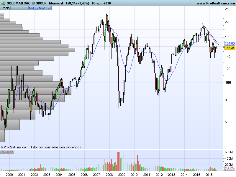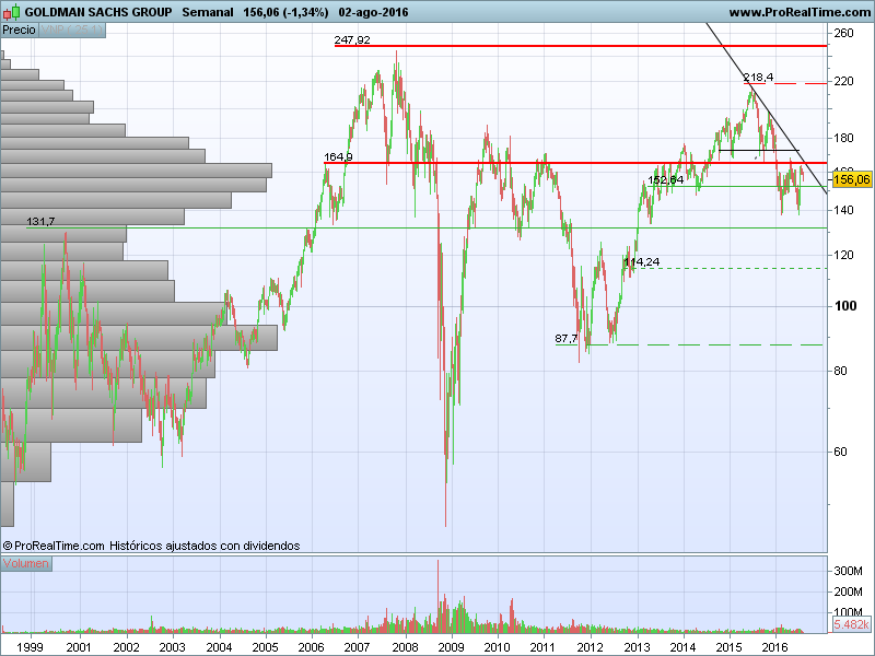 En los anteriores gráficos de Goldman Sachs, mensual y semanal respectivamente, podéis observar los niveles de precio más relevantes que os servirán para señalar los strikes más palpitantes, son: 200, 180, 160, 140, 100. Nuestra apuesta incluso contempla que alcanzará el valor 60, señal que indicará las más que inevitable quiebra.